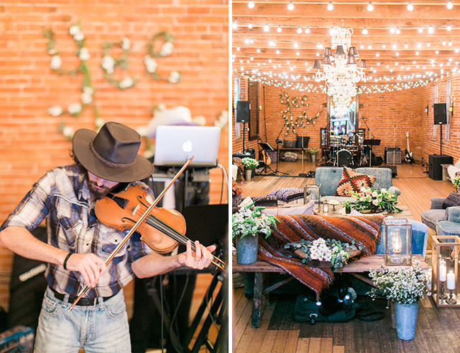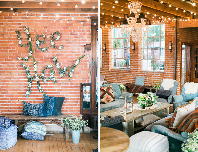 The dance floor sparkled with custom market lights and comfy lounges designed by Beth Helmstetter Events. Can we take a second to admire that denim Found Rentals furniture?! Found Rentals brought in all of the amazing rustic style furniture to transform the space and Hidden Garden Flowers and Art With Nature created incredible floral displays!